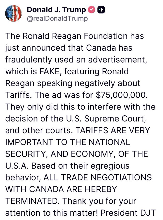 “The Ronald Reagan Foundation has just announced that Canada has fraudulently used an advertisement, which is FAKE… They only did this to interfere with the decision of the U.S. Supreme Court.”